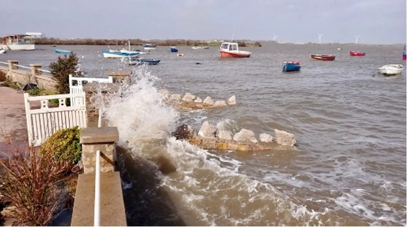The tide lashing the flood defence at the entrance to the Anchorage in February 2020: Courtesy of the Gardner family