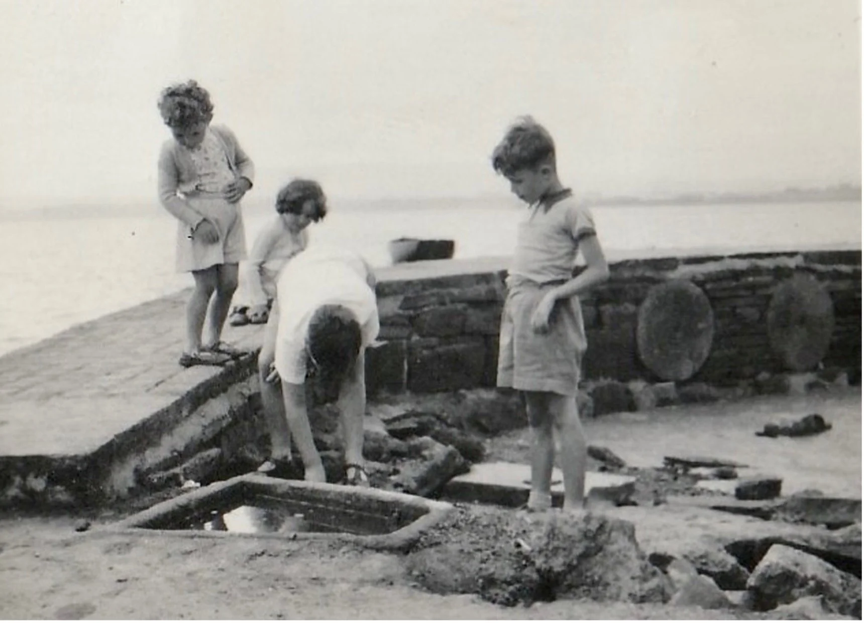 Robert and Gertie’s grandchildren, Robert Greenfield with Roger, Douglas and Jill Gardner, on the pier in 1957. Notice the wartime concrete cylinders in the structure and the stone trough in the foreground, now located on the right-hand side of the Anchorage gates.