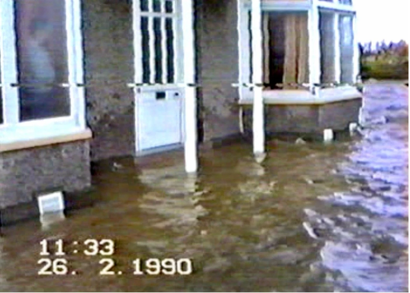 Still from a film showing the tide up to the front door in 1990: courtesy of the Gardner family.