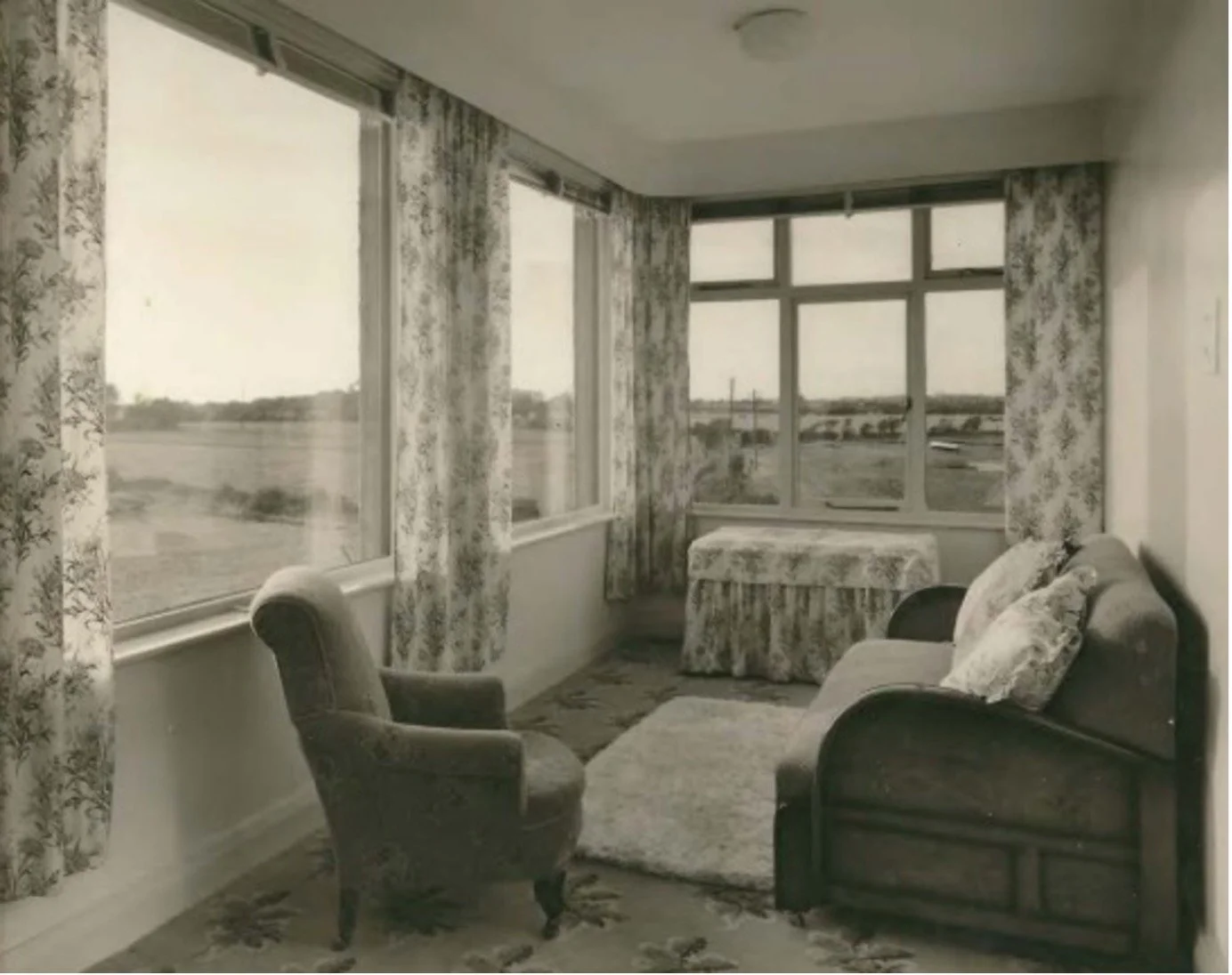 The Sunlounge, furnished c. 1956, with a view of Beany Hill and Meadow Farm to the left: From the Gardner family collection