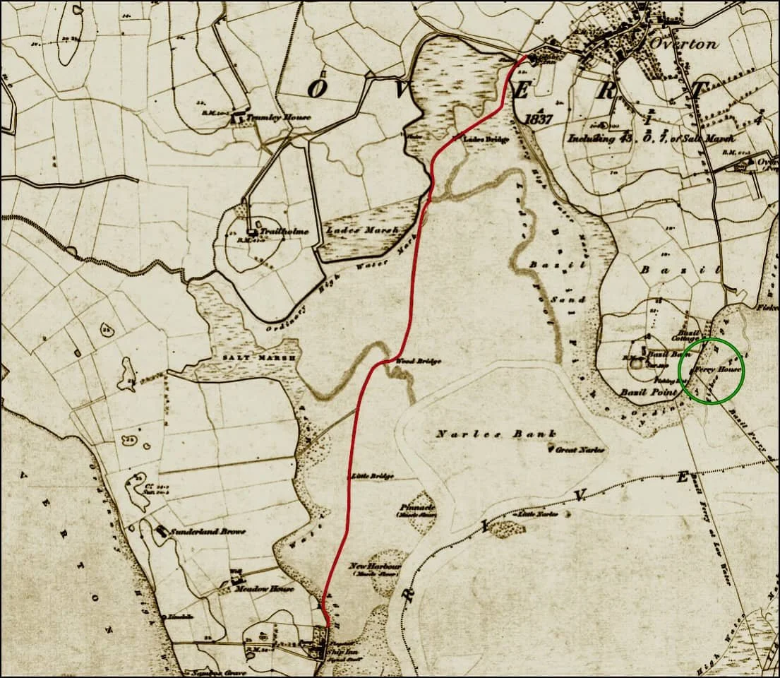 The landing stage at Overton (green) and the causeway (red) on the 1840s Ordnance Survey Map: Courtesy National Library of Scotland.