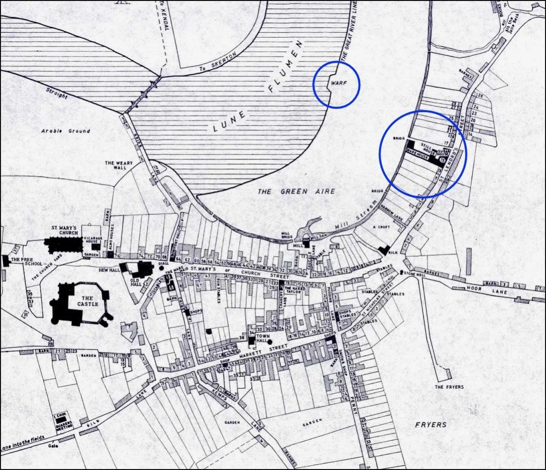 The location of the wharf, bridge, and Sugarhouse of John Lawson: Docton’s Map of Lancaster in 1684: Courtesy the Historic Society of Lancashire and Cheshire.