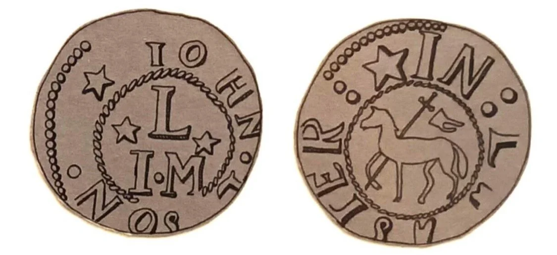 While researching, I came across a fascinating detail: these are tokens issued by John Lawson, used as a substitute for money and valued at a farthing. I was thrilled to see explicit confirmation of John’s wife’s name. The token features an “L” for Lawson, an “I” (which, in Secretary Hand, is also a “J”) representing John, and an “M” for Margrett, née Edmondson—though the spelling of her name varies across records.