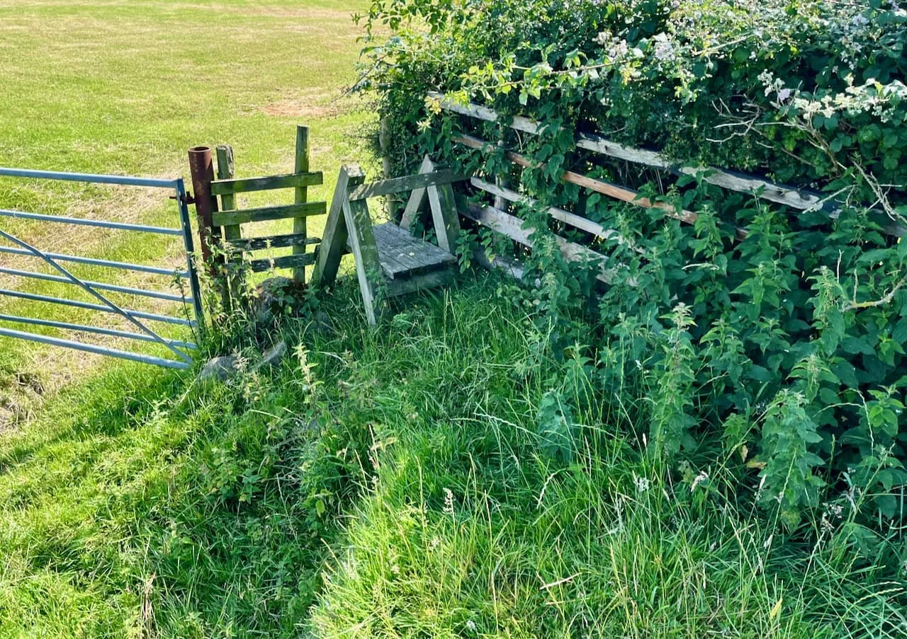 BRAMBLE RAMBLE: Taking care to avoid bramble snags and stinging nettles, over the rickety stile and turn left.
