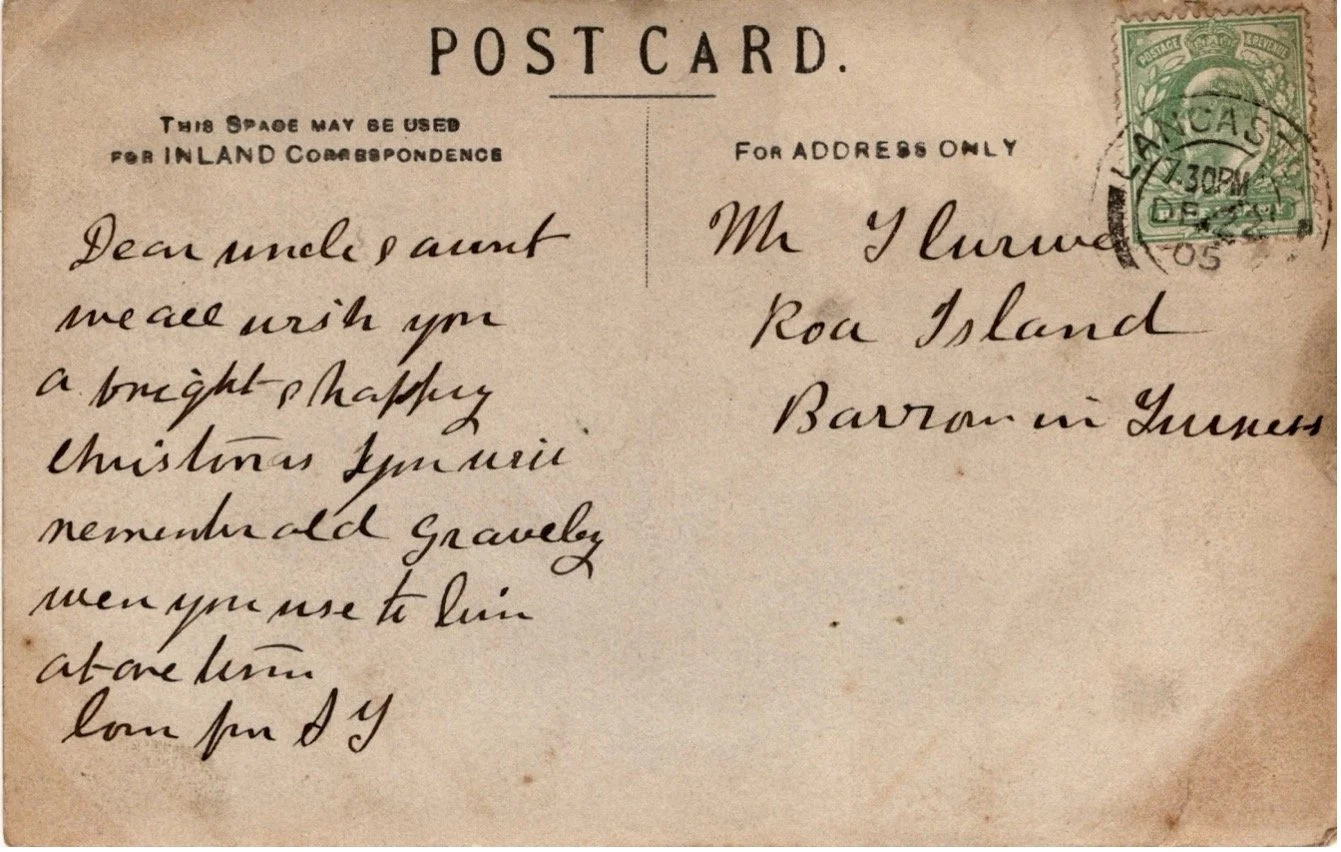 A Christmas greeting sent in 1905 to Thomas Curwen, aged 80, still living on Roa Island, by a niece or nephew reads, "Dear Uncle and Aunt, we all wish you a bright & happy Christmas. If you will remember old Gravely, where you used to live at one time."