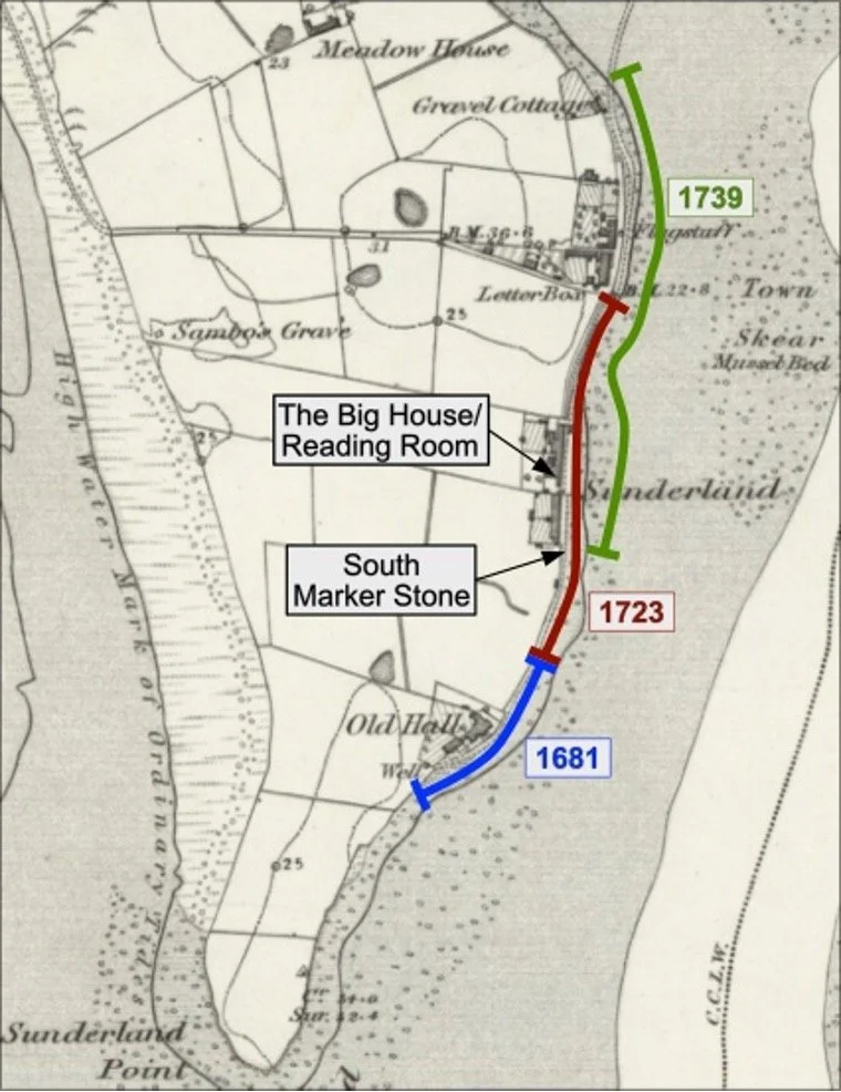 The boundry wording reads ‘thence Northwards to a certain other Stone Post or Boundary fixt opposite to the North end of a certain Blockmakers Shop at Sunderland aforesaid belonging to Mr Robert Lawson markt “N.1739” in length from North to South about 510 yards and bounded on the East side by the River Loyne and on the West side by the Houses and lands at Sunderland aforesaid.’
