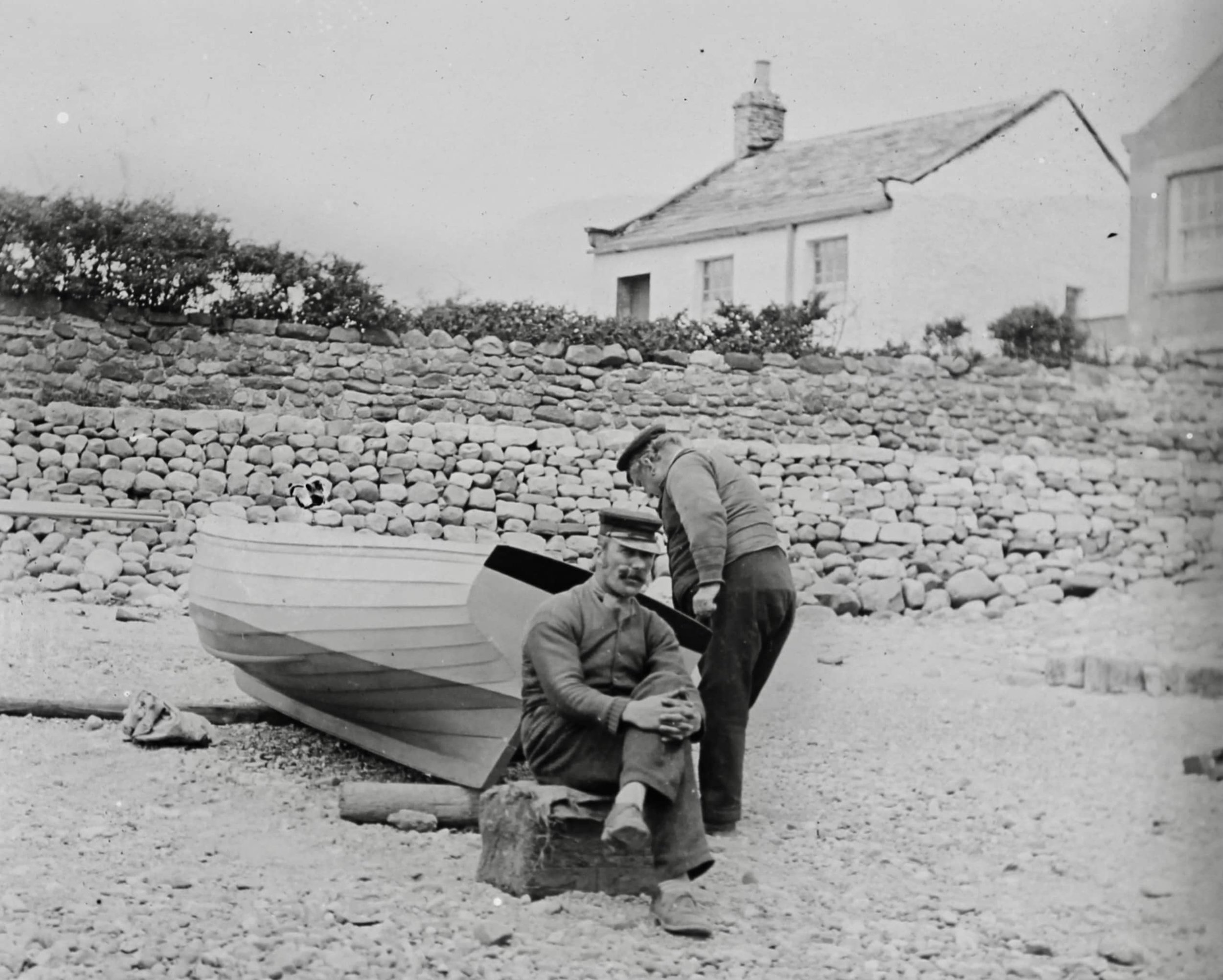 Tom Spencer (front), and James boat painting on the shore, with Upsteps Cottage in the background, c1900: A John Walker photo courtesy of Lancaster City Museums.