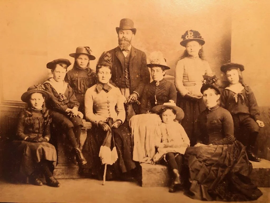 The ‘Golden Wedding’ photograph. From left to right, Beatrice, William (junior), Edith, Eliza, William (senior) Katharine, Muriel, Florence Sproat (daughter of Eliza) Harriet (wife of William) and John: Courtesy of the Gilchrist family