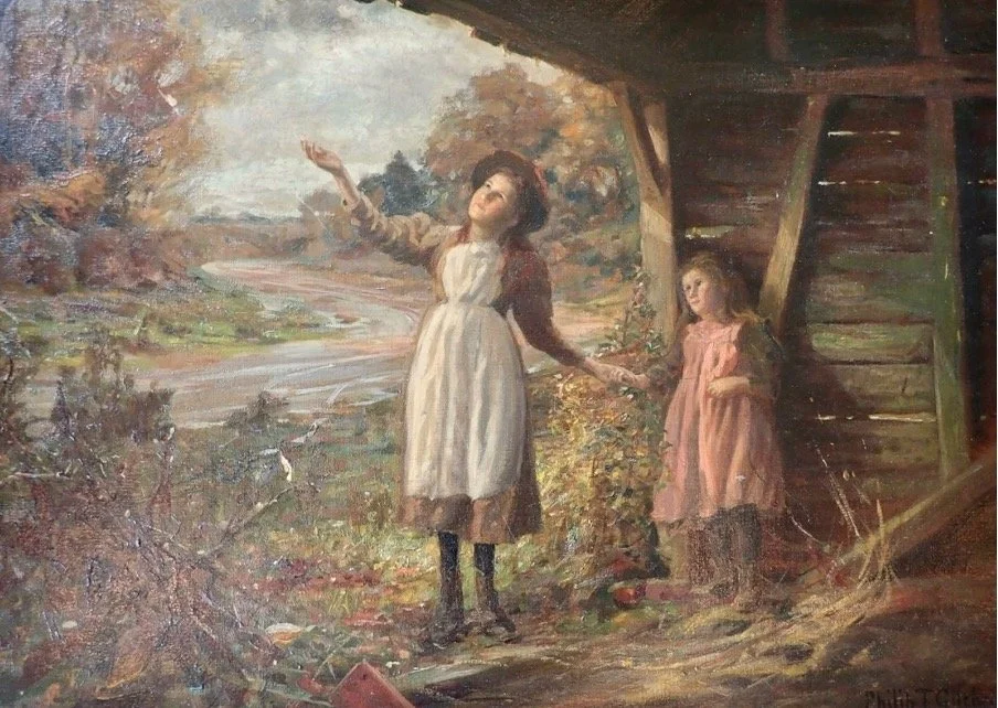 In this charming narrative picture, Philip shows versatility. A critic wrote, ‘His ‘Clearing up’ is a very pleasant picture showing two little girls who, after sheltering from a shower under a shed, are anxious to see if the rain is over. In this picture, there is evidence of careful composition and real pictorial feeling. (Manchester Evening News)