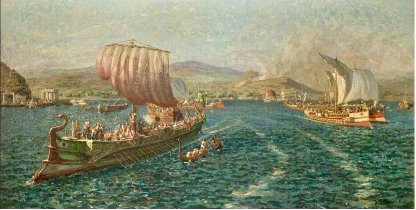This is the CGI of the time, a depiction of a historic event brought to life. It shows the evacuation of the Athenians in 480 BCE as the Persians, led by Xerxes, attack the city. The wind in the sails and the diverging ships suggest movement and urgency, while the vivid colouring enhances realism—a picture of exquisite detail, a delight for traditionalists.