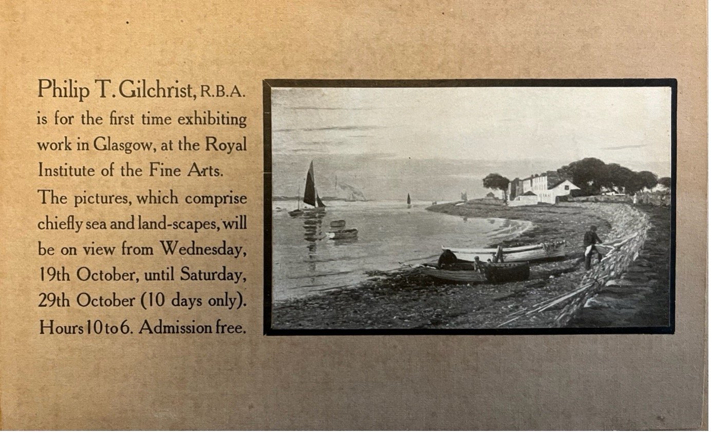 “Mr Philip T Gilchrist makes considerable headway in his work and is fond of the bright side of nature. His picture “Fishers of Phaleron” shows that the artist has revelled in the pure atmosphere of foreign climes, which, combined with the costume appropriate thereto, has enabled him to produce a picture full of good colour and interesting human movement.