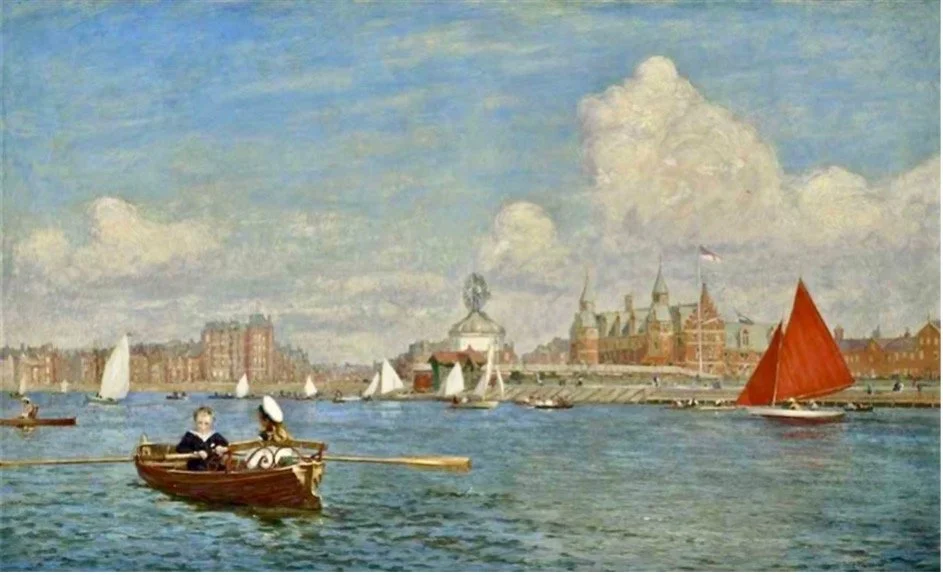 The superb “Southport Marine Lake”, which depicts the town’s famous boating lake, was a great success and was much praised in the local newspapers. ‘It is a scene that may be witnessed on any bright summer day, full of the gaiety of dancing small craft on gently rippled water.’