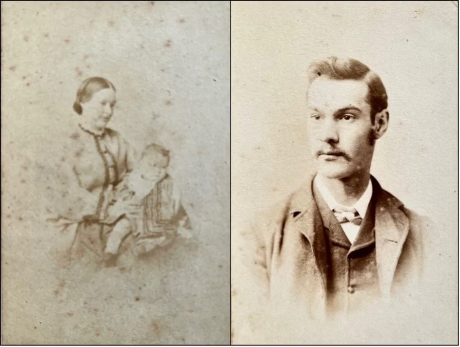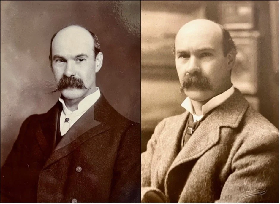 Two formal portrait photographs of Philip, on the left, taken in London, he is younger, very dashing, with an outstanding moustache.