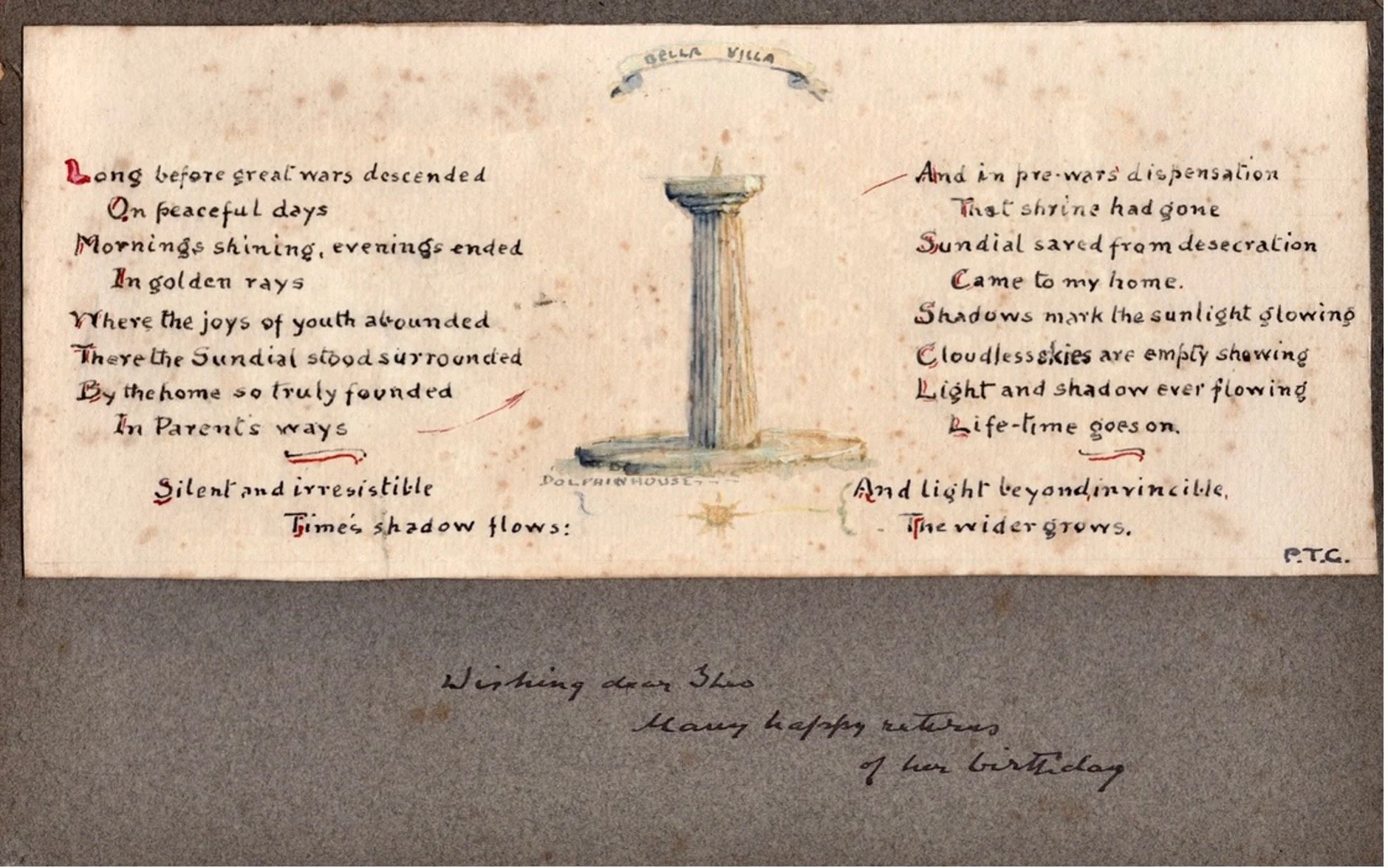 This one is for Theo and includes the sundial, once at Bella Villa, now in the Garden at Dolphin House, a symbol of shared childhood.