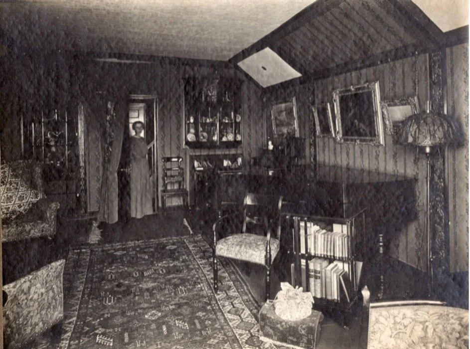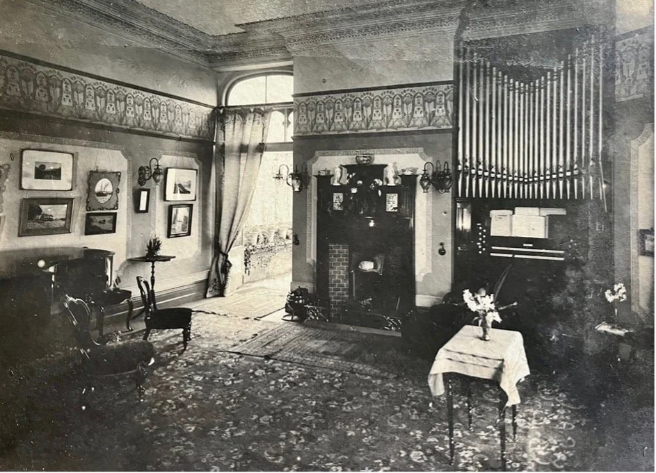 Inside Bella Villa, c1890.The pipe organ has music pages open at the ready.