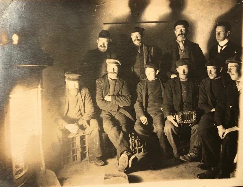 This photograph shows villagers warming themselves in Philip’s studio, in the same building as the Reading room, sitting on beer crates beside a blazing fire, with a concertina ready for song.