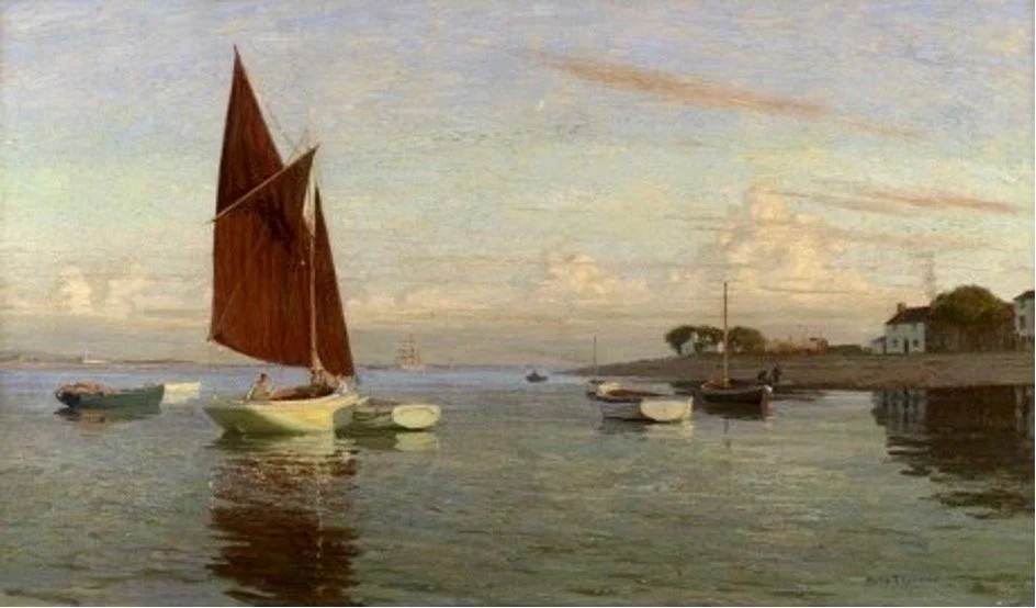 The subline “Back to the Moorings”, in a similar dreamy style to “A Forgotten Port”, was shown at the Royal Academy in 1909. In a private collection.