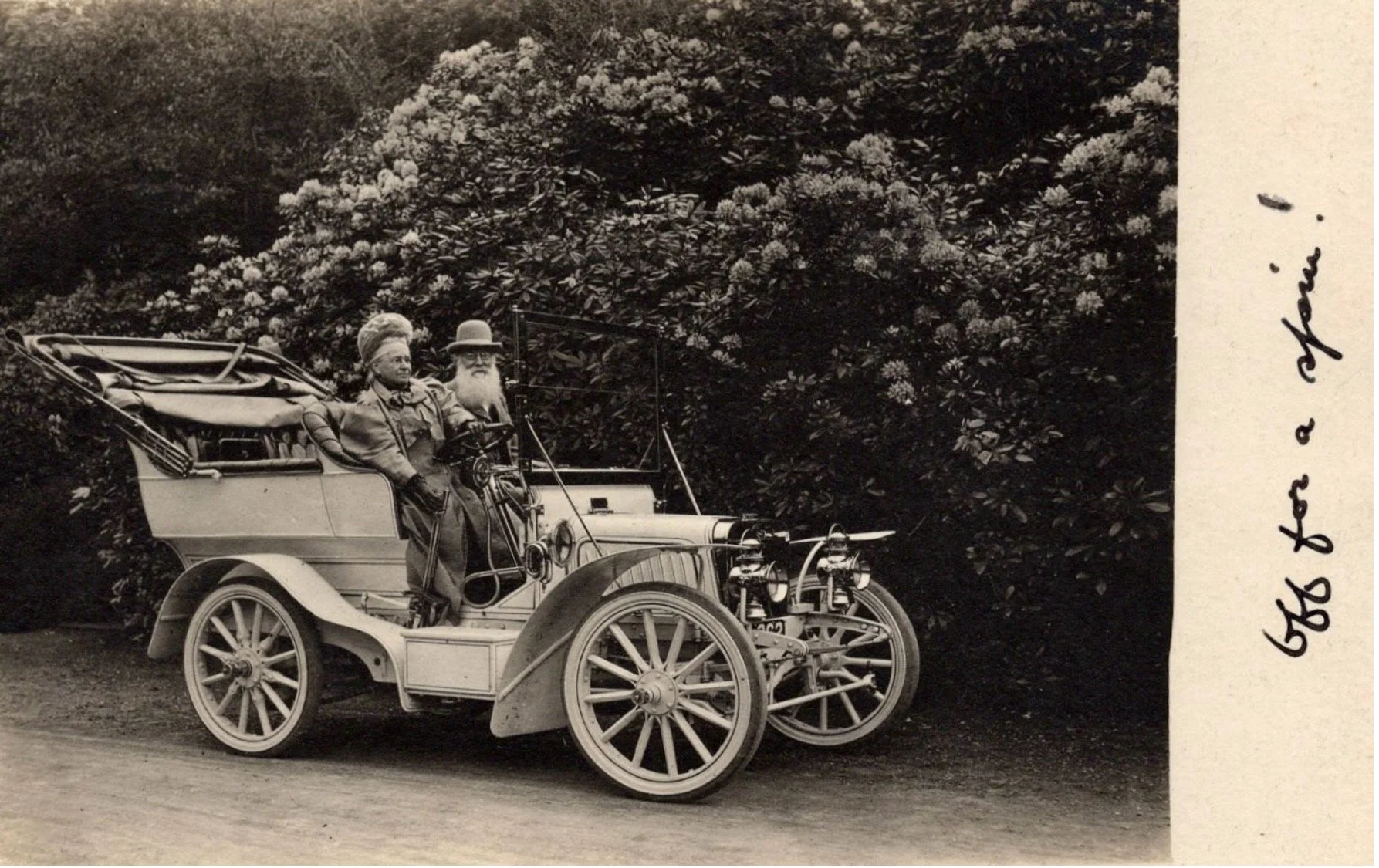 Here they are once more. Jane is pretending to be the driver. This photograph, sent by Philip in 1909 to his brother William marked, ‘Off for a spin!’ George is smiling happily at the joke.