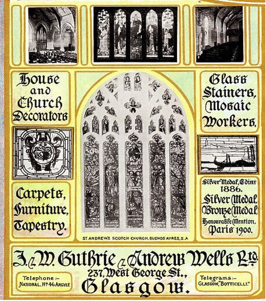 After ten years Andrew Wells returned to Glasgow to become a director of Guthrie, Wells & Co, decorators, dealers, and makers of stained glass. In the 1890s it was the most prestigious firm of its kind in Glasgow receiving commissions from leading architects including Charles Rennie Mackintosh.