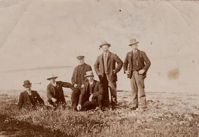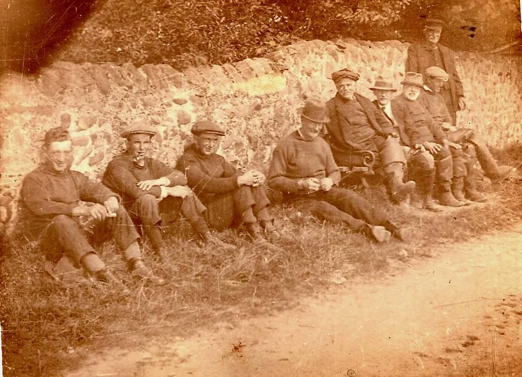 This photo is dated 1925 and is a mixture of generations. They are surprisingly, not on seat at the top of the Lane, but on the seat between numbers 3 and 4 on First Terrace - and spilling over onto the grass. All are men, and all but one wears a hat, only one is unknown. The photographer is also unknown, but luckily the names have been written on the back.